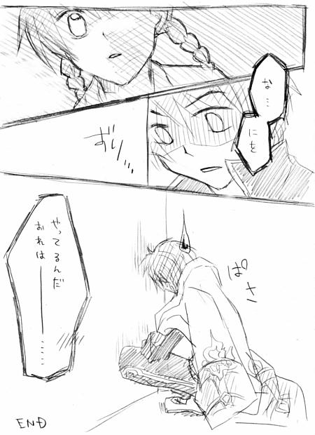 ほんとは今から続き描こうかなーと思ったんですが、 眠いわ…… しかも明日夕方から面接だ。。。 何も用意してない。 さすがに今から絵描いてちゃアホだろと。 いや、すでにアホ丸出しなんですけども…… あぁ、 まだ就活やってますよ。 明日朝早く起きて用意します…… 2010/06/01(Tue) 00:22:21